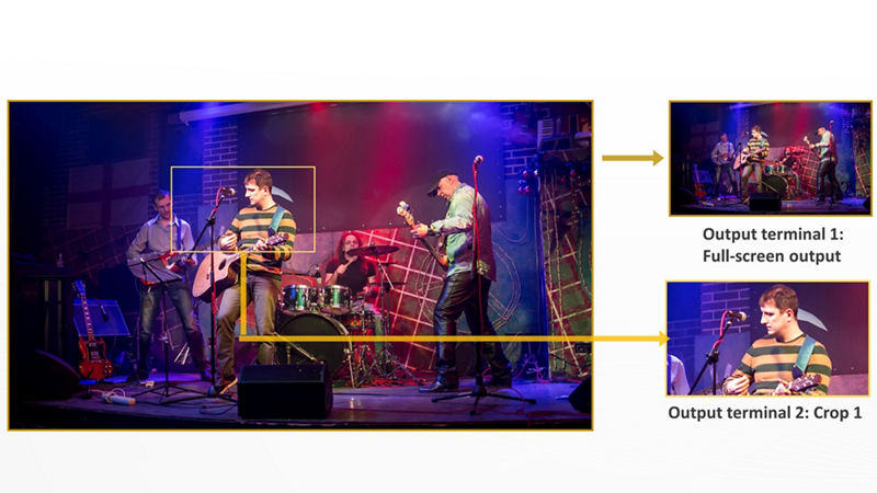 Select and extract a point of interest via a separate feed. The chosen area can then be output as a main or secondary signal and up to two cropped areas can be set in FHD.
